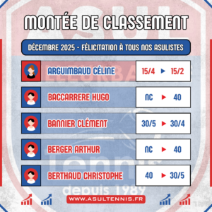 Ce mois-ci, 37 de nos licenciés sont montés de classement sur le mois de novembre ! Vous les trouverez sur…