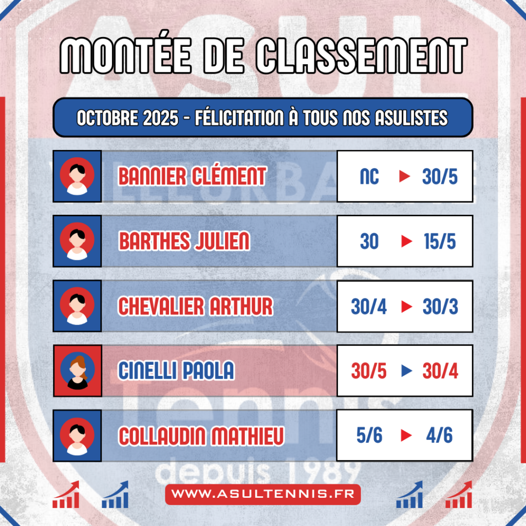 Ce mois-ci, 12 de nos licenciés sont montés de classement sur le mois de Septembre ! Vous les trouverez sur les photos ci-dessous. Félicitations à nos ASULISTES pour leur progression…