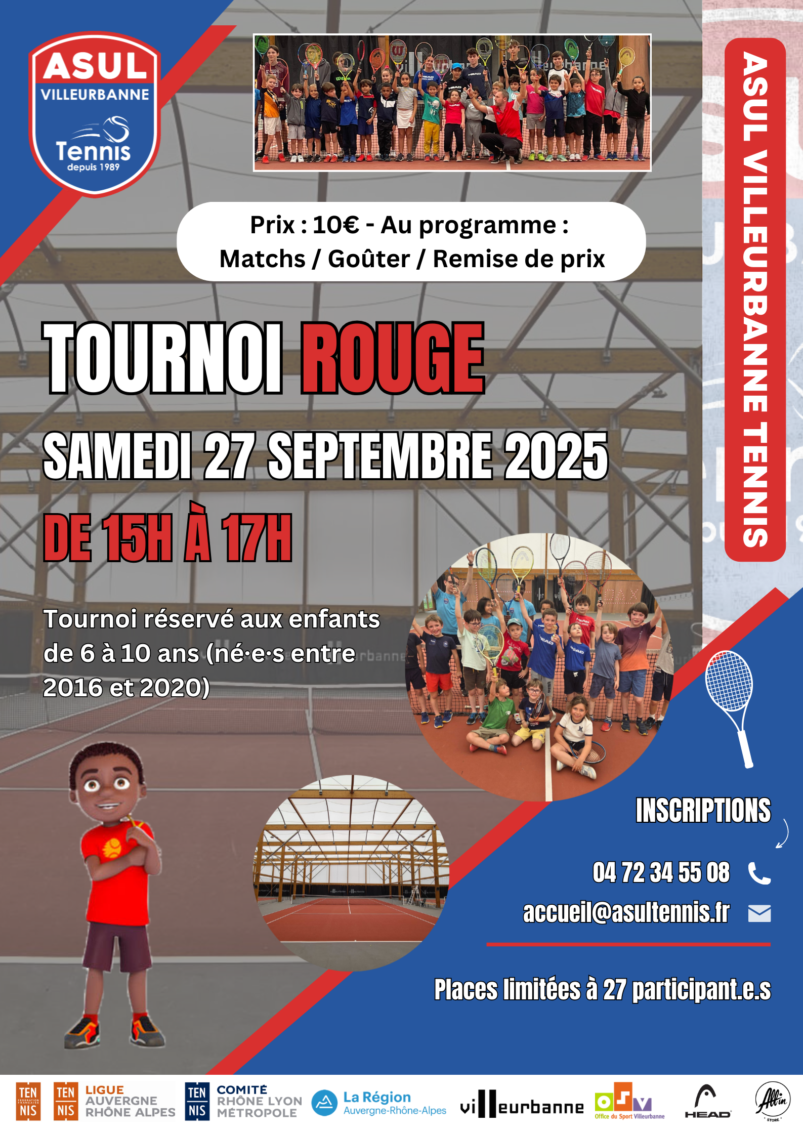 ASUL Tennis Villeurbanne 60 rue pierre baratin, VILLEURBANNEDESCRIPTION : L’ASUL Tennis organisera le samedi 15 mars 2025, un tournoi pour tous les jeunes, du club ou non, évoluant au format rouge de 15h à 17h. Ce tournoi…