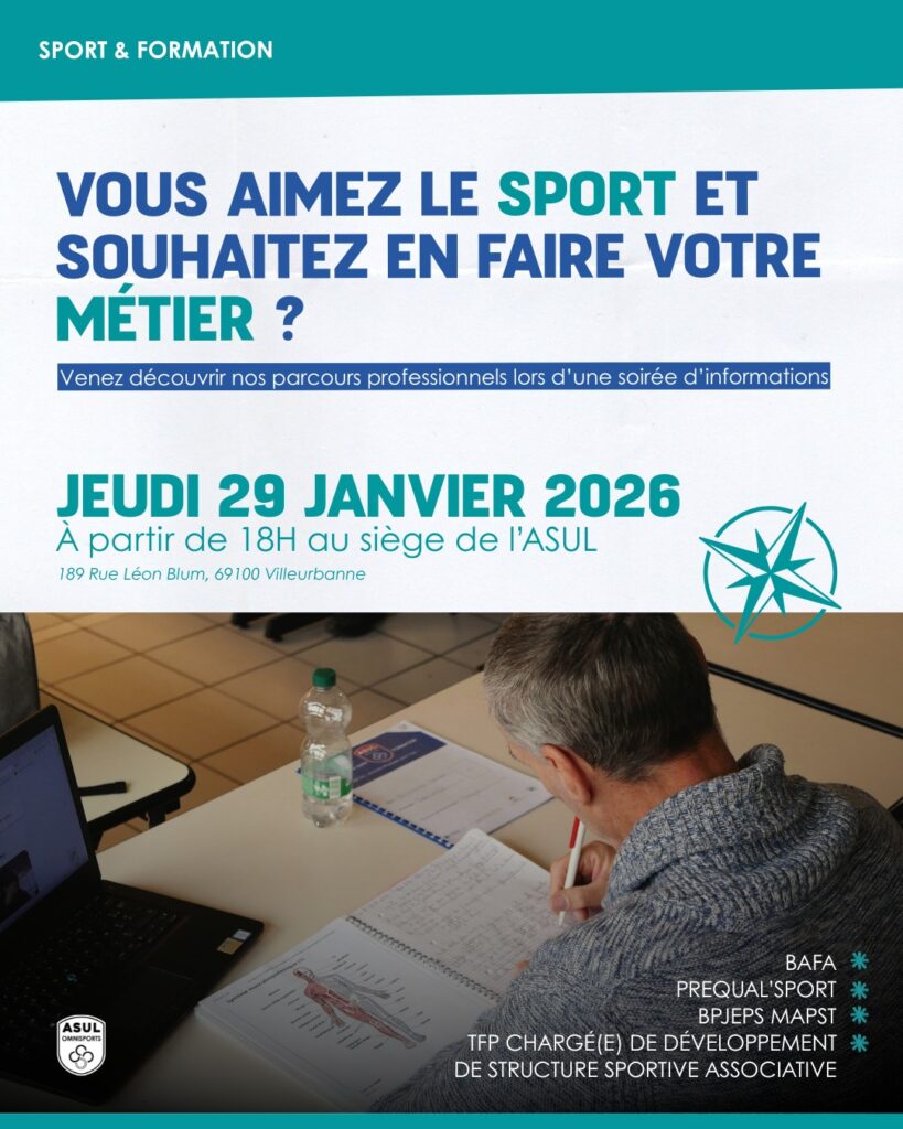 Cela aura lieu le jeudi 29 janvier 2026 à partir de 18H au siège de l’ASUL Omnisport – 189 rue Léon Blum, Villeurbanne. Inscription obligatoire via le lien : https://forms.gle/3m6wHQpyXitKMCyZA